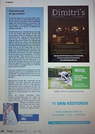 Elke 3 maanden schrijft Satya Prana Mata een column voor Topic, het regiomagazine van Heumen en Mook-Middelaar. Bij deze het column uit de herfsteditie 2025: